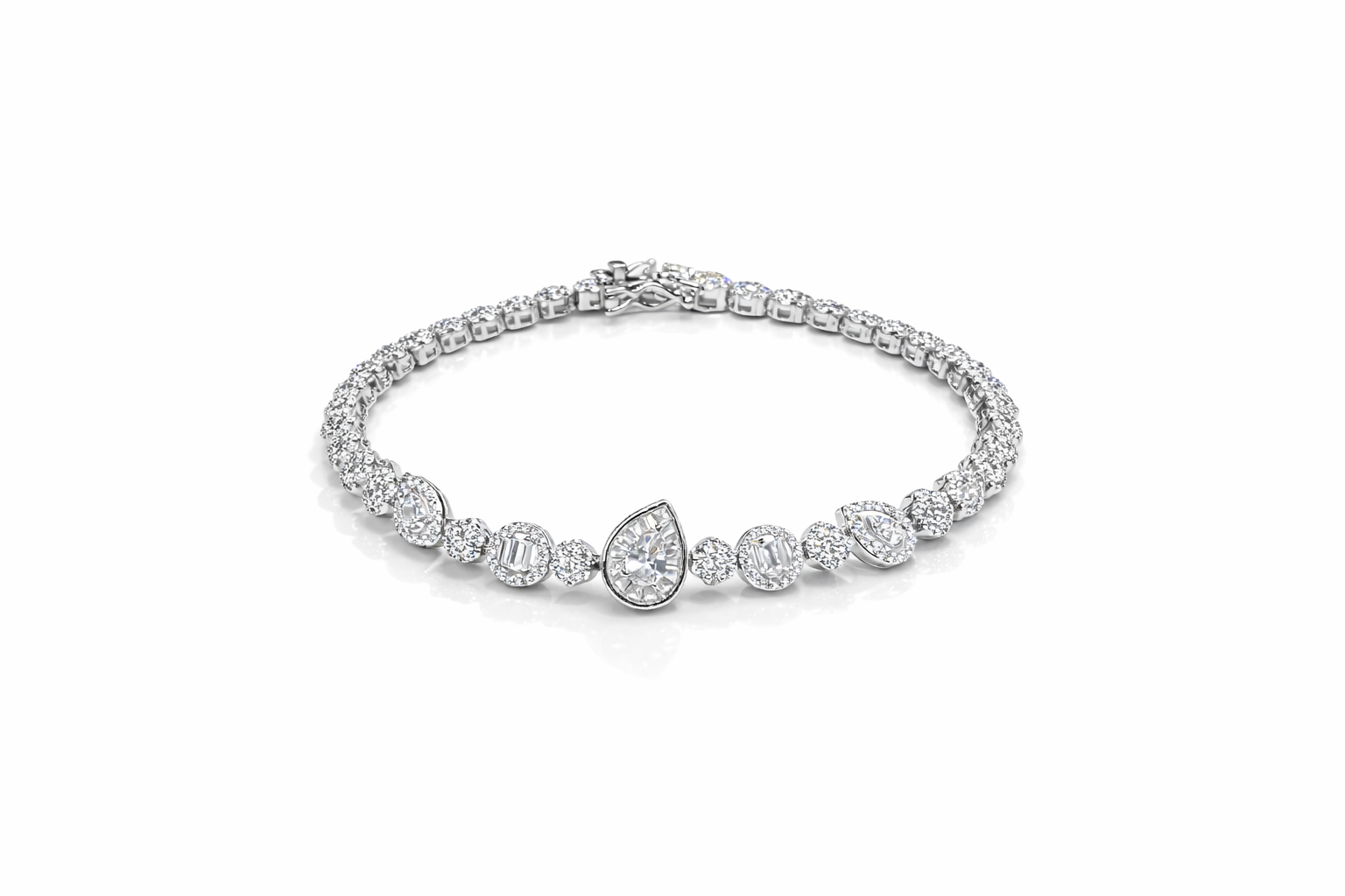 Make a statement of timeless elegance with the Celestia Pear Halo Tennis Bracelet. Crafted from genuine 925 sterling silver, this exquisite piece features a graceful pear-shaped centerpiece framed by a delicate halo of sparkling stones, flowing seamlessly into a classic tennis bracelet design.